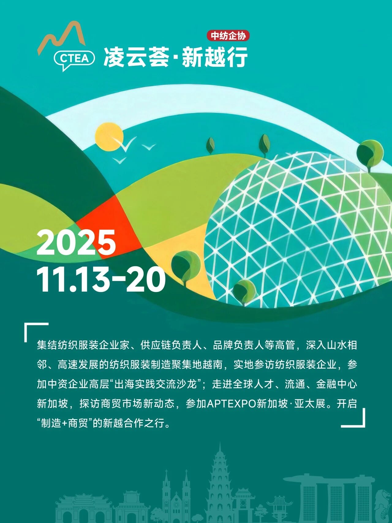 深入全球制造新枢纽、对标创新发展新高地。越南是世界第二大纺织品服装出口国。在国际贸易壁垒不断加剧、国内外市场需求持续疲弱的态势下,越南在国际资本、关税优惠、要素成本、人口红利、投资政策、地理位置等方面吸引了越来越多的投资者关注。新加坡是众多国际品牌的亚太总部,拥有前沿的设计理念、品牌战略和营销渠道,同时在商贸运营、绿色金融,循环经济等方面处于国际领先地位。2025年11月13日-20日,中纺企协“凌云荟·新越行”集结纺织服装企业家、供应链高管、品牌负责人等,深入东南亚腹地,共享全球纺织服装供应链盛会——新加坡·亚太展APTEXPO,实地走访纺织服装企业,洞察消市场费趋势,开启“从制造到商贸”的新越合作之行。