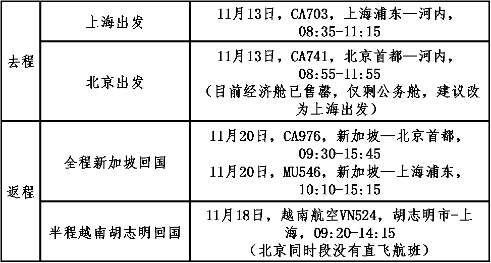 (2)为了方便组团出行,国内飞越南河内和新加坡回国(以及胡志明回国)的经济舱机票建议按照如下推荐的往返航班号自行预订(不按照此日期和航次预定的行程,主办方不承担机场的接送)。参团成员也可委托主办方按如下表格信息代订(按实际出票时间当时价格为准)。分区域推荐的往返经济舱航班号、起降时间如下: