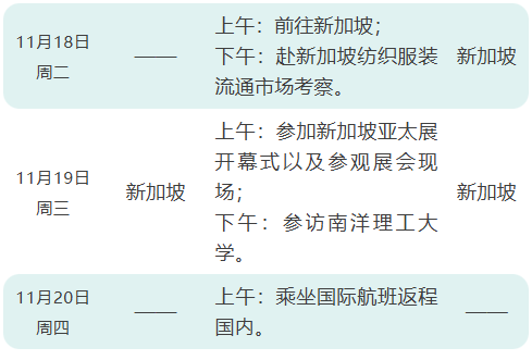 全程暂定覆盖越南纺织服装领军企业国有第十服装厂,北江LGG(波司登、优衣库等品牌合作方),河丰集团,越南本地头部纺织印染企业宝明纺织,裕纶织布厂,越南纺织服装专业高等院校河内纺织工业大学,溢达集团海外公司声白集团,山东鲁泰国际布局的越南鲁泰公司,APTEXPO新加坡•亚太展,世界著名学府新加坡南洋理工大学等,通过零距离的直面接触和深度学习考察,力争促成国内外纺织服装行业及企业之间的学习交流与合作共赢。