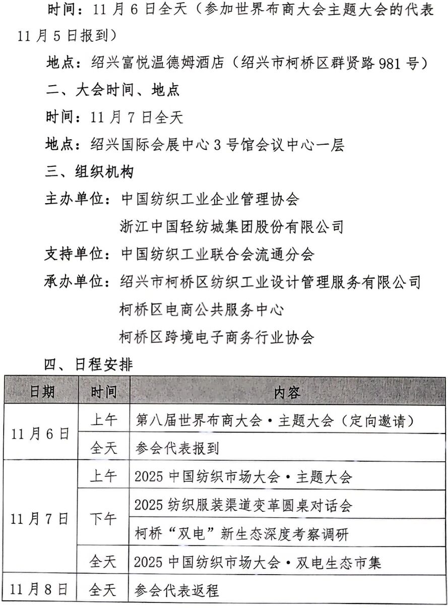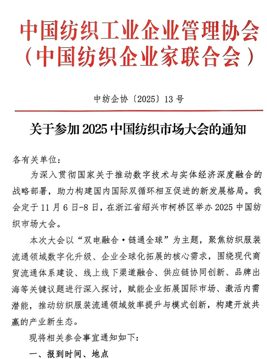为深入贯彻国家关于推动数字技术与实体经济深度融合的战略部署,助力构建国内国际双循环相互促进的新发展格局。中国纺织工业企业管理协会定于11月6日-8日,在浙江省绍兴市柯桥区举办2025中国纺织市场大会。