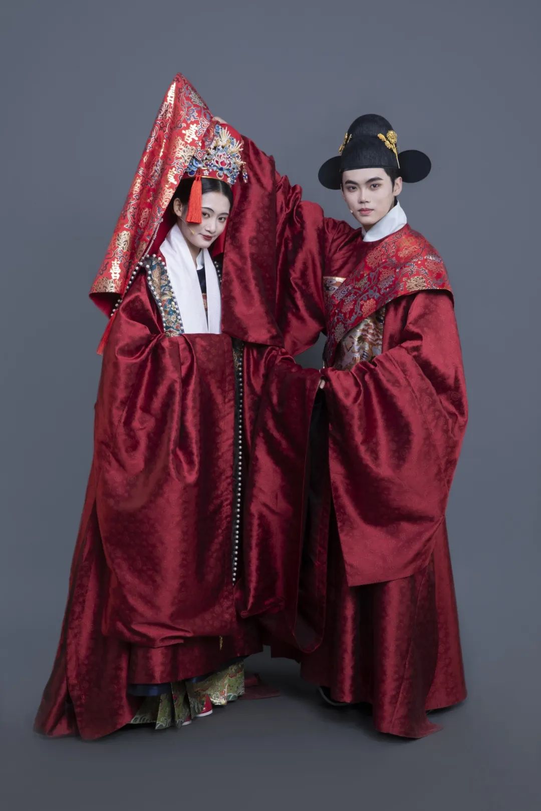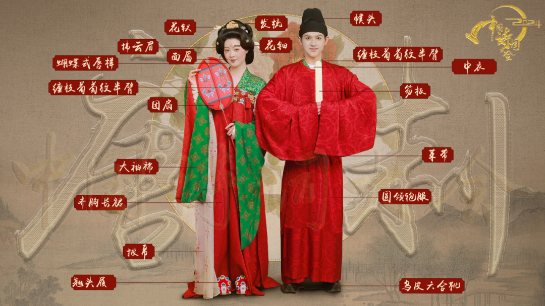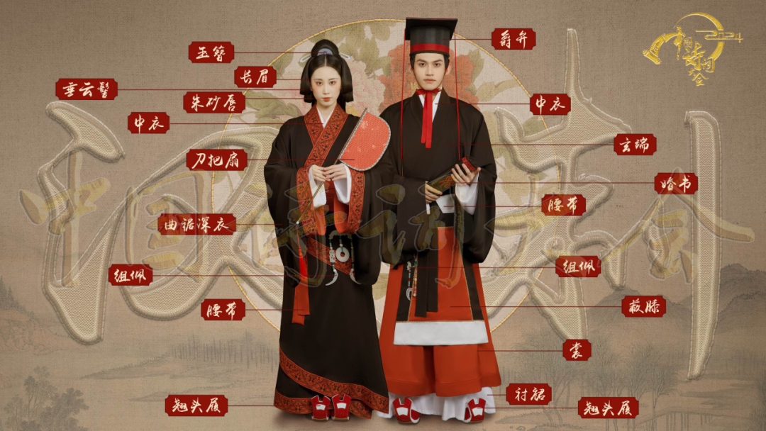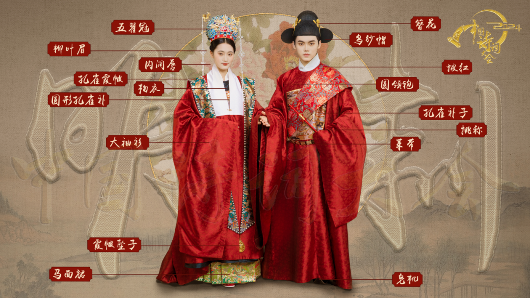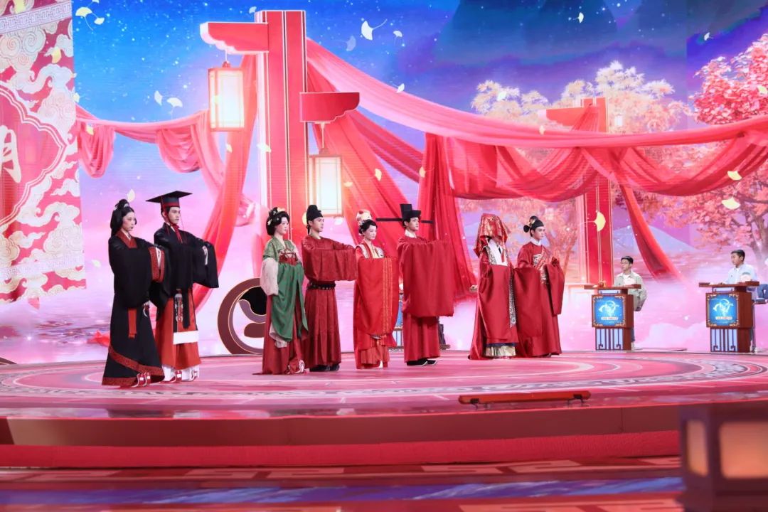 本期《中国诗词大会》节目展现了汉、盛唐、宋、明四个极具代表性朝代的婚礼场景,呈现手执婚书、团扇掩面、共系同心结和执杆掀盖四个场景。中华传统婚服体现了中国婚礼服饰的独特文化魅力与深厚文化底蕴,作为承担此次服装复原任务的梁燕教授团队,共11人分为4个执行小组,历时两月余,参考全国40余所博物馆馆藏的110余件文物、200余册古籍及文献资料、300余张书画及壁画图片,从服装与礼制的关系,到服装型制、用色、纹样复原、面料选用、模特妆容打造等,力求达到最大限度的专业性、真实性、准确性。最终完成秦汉10件服装、8件配饰,唐代12件服装、8件配饰,宋代11件服装、7件配饰,明代13件服装、9件配饰,共计8套婚服、46件服装的婚礼服饰研究与复原。