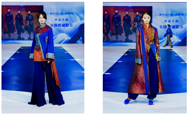 纪恩峰设计的《锦色澜影:东方华裳的摩登逸韵》系列作品,以 “东方传统美学与现代时尚深度融合” 为核心设计主题,巧妙选取传统蓝染的靛蓝色作为主色调,搭配赤、橙、棕等鲜明色彩,通过拼接、渐变等精湛设计手法,将东方文化的深厚底蕴与独特魅力融入服装服饰之中。作品既保留了传统东方元素的雅致韵味,又赋予其符合当代审美的时尚表达,让古老的东方文化在现代时尚语境中重焕生机,传递出独特的东方时尚态度。