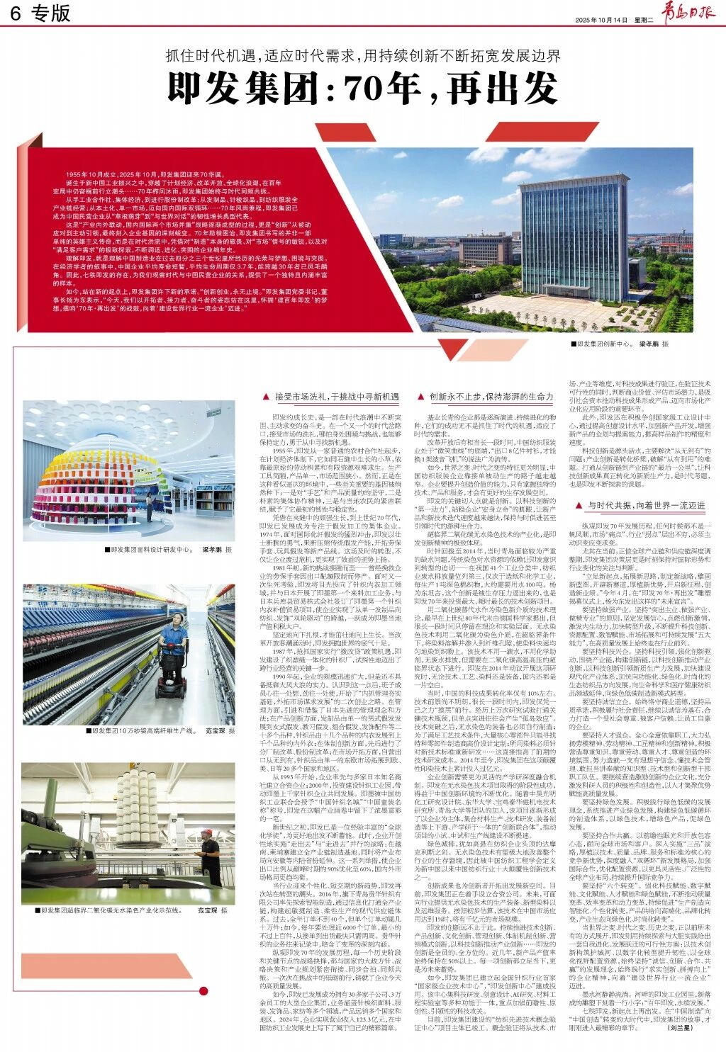 10月14日,《青岛日报》以《即发集团——70年,再出发》为题,深度解读了中纺企协理事单位青岛即发集团股份有限公司基业长青的密码。报道特别聚焦于企业以“超临界二氧化碳无水染色”等颠覆性创新,构筑核心竞争力的战略实践,展现了传统产业向“新”而行的澎湃动力。